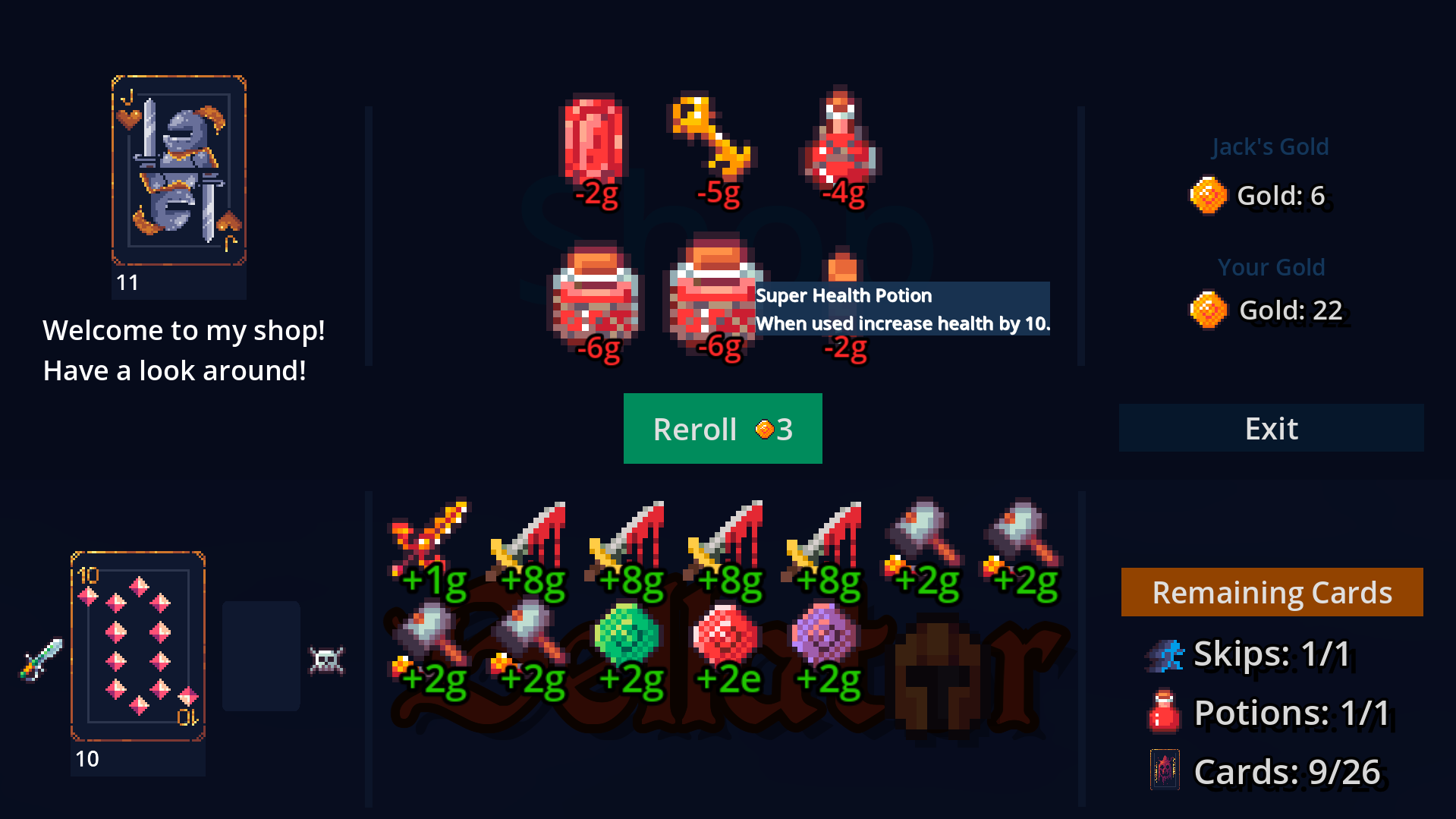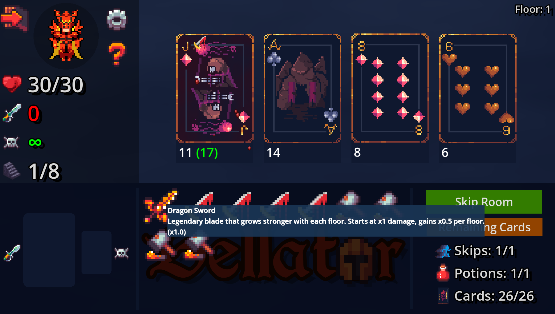 Bellator is a strategic roguelike deckbuilder where every card, relic, and decision matters. Battle through procedurally generated floors with a deck of playing cards enhanced by powerful relics. Manage your durability, build devastating synergies, and survive increasingly dangerous encounters.